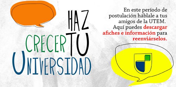 En este periodo de postulaciones, invita a tus amigos a ser parte de nuestra Universidad. Difunde la Guía Académica UTEM para que conozcan las carreras que impartimos. Te invito a descargar el material adjunto y reenviarlo. Afiche Oferta Académica Guía Académica Portada para Facebook Avatar Facebook Avatar Twitter